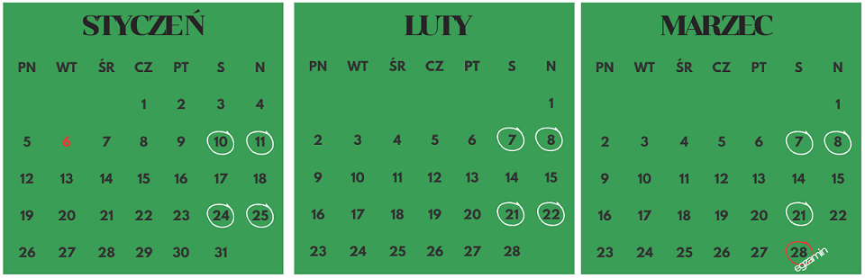 - zajęcia odbywają się z reguły co 2 tygodnie w soboty i w niedziele w godzinach 09:00 - 14:45 lub 15:30